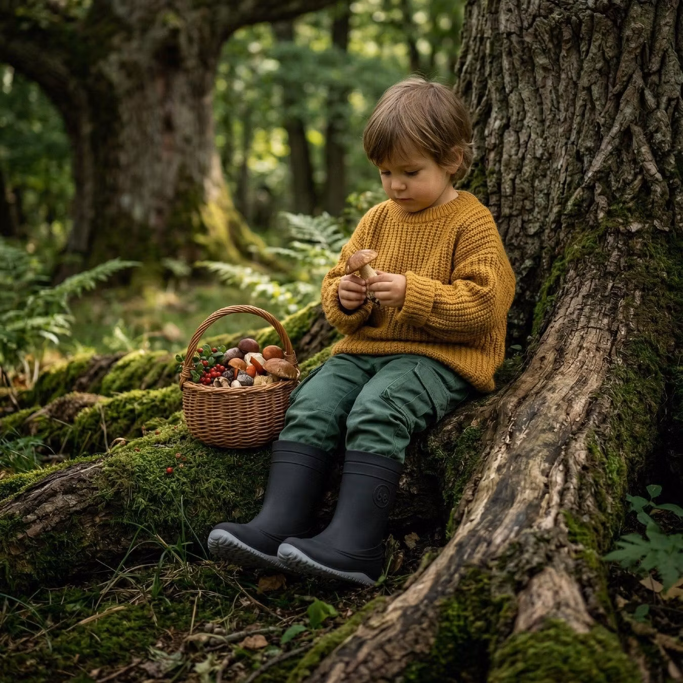 Barn som leker och rör sig i regn, lera och skogsmiljö – perfekt för förskola, vardag och utomhuslek där man vill kombinera torra fötter med naturlig rörelse.