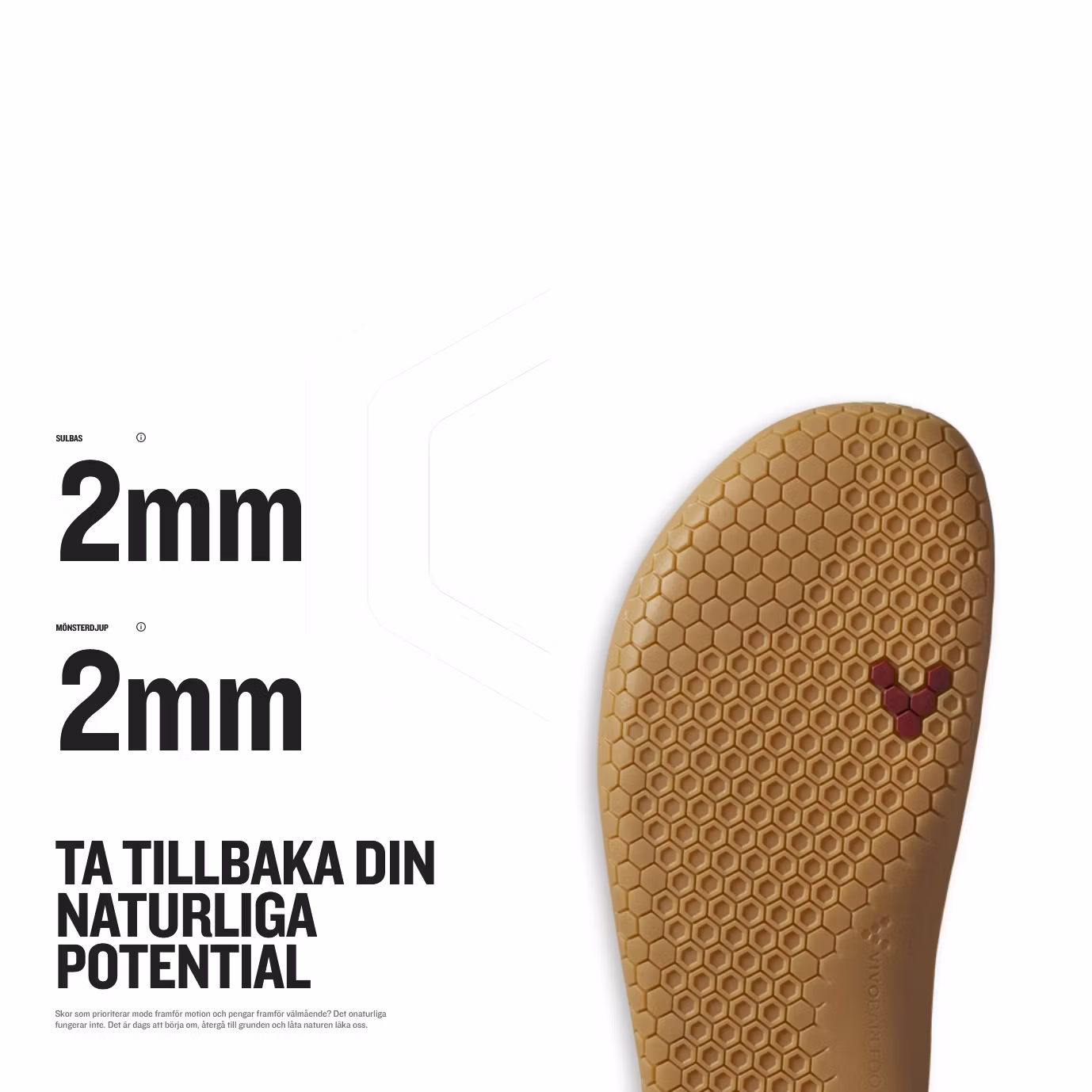PRIMUS YTTERSULA - Primus är en lätt yttersula med hög prestanda som bara är 2 mm tjock, för att ge tunnast möjliga skikt mellan fötterna och marken. Sidoprofilen är lägsta möjliga, vilket ger en aning lägre profil mot hälen, och sulan överlappar tån på ett subtilt sätt, något som ger tillräckligt skydd i stadsmiljö, utan att hämma naturliga rörelsemönster. Starka geometriska former leder till starka fötter och sulan har därför vårt hexagonmönster för att ge bättre flexibilitet och fäste i flera riktningar.